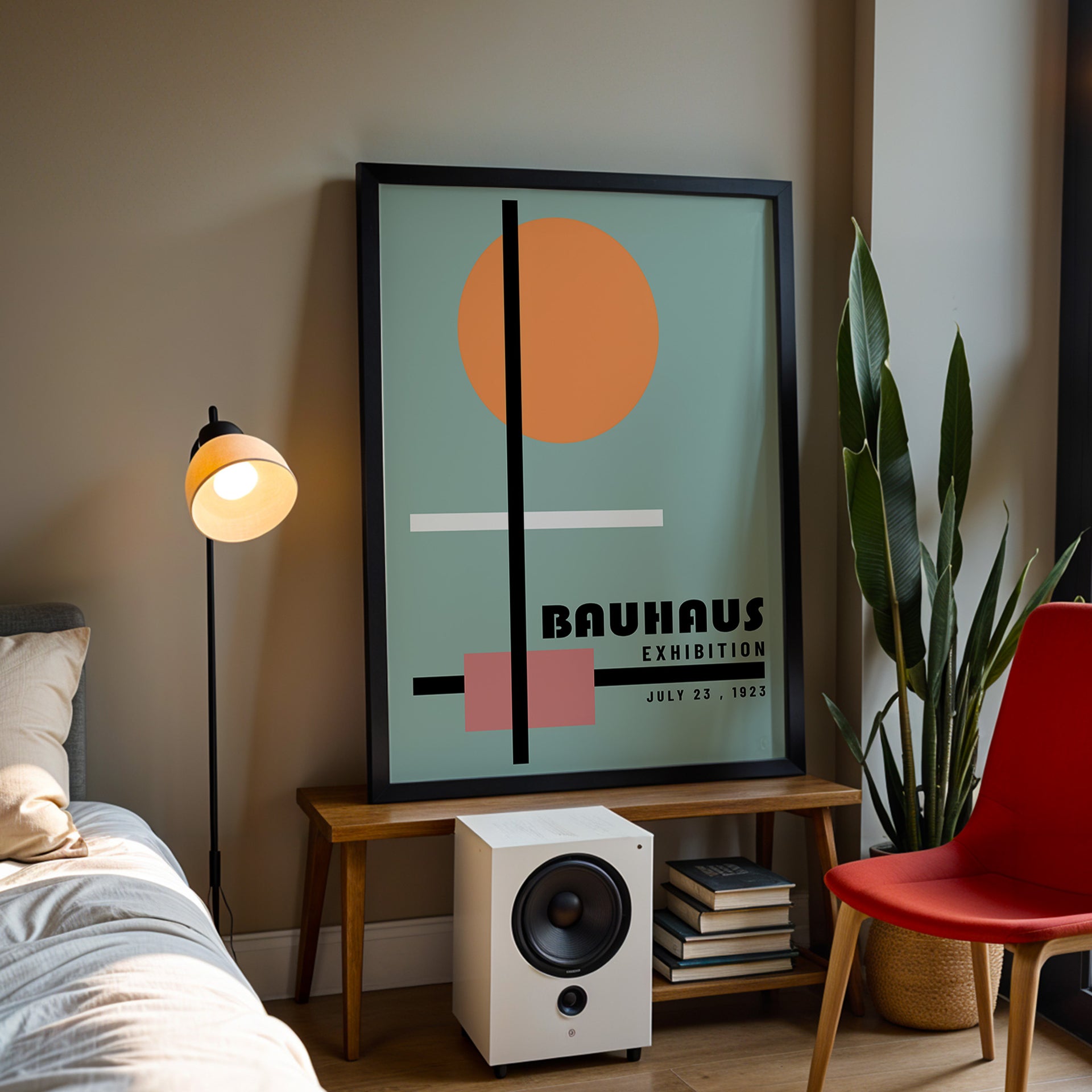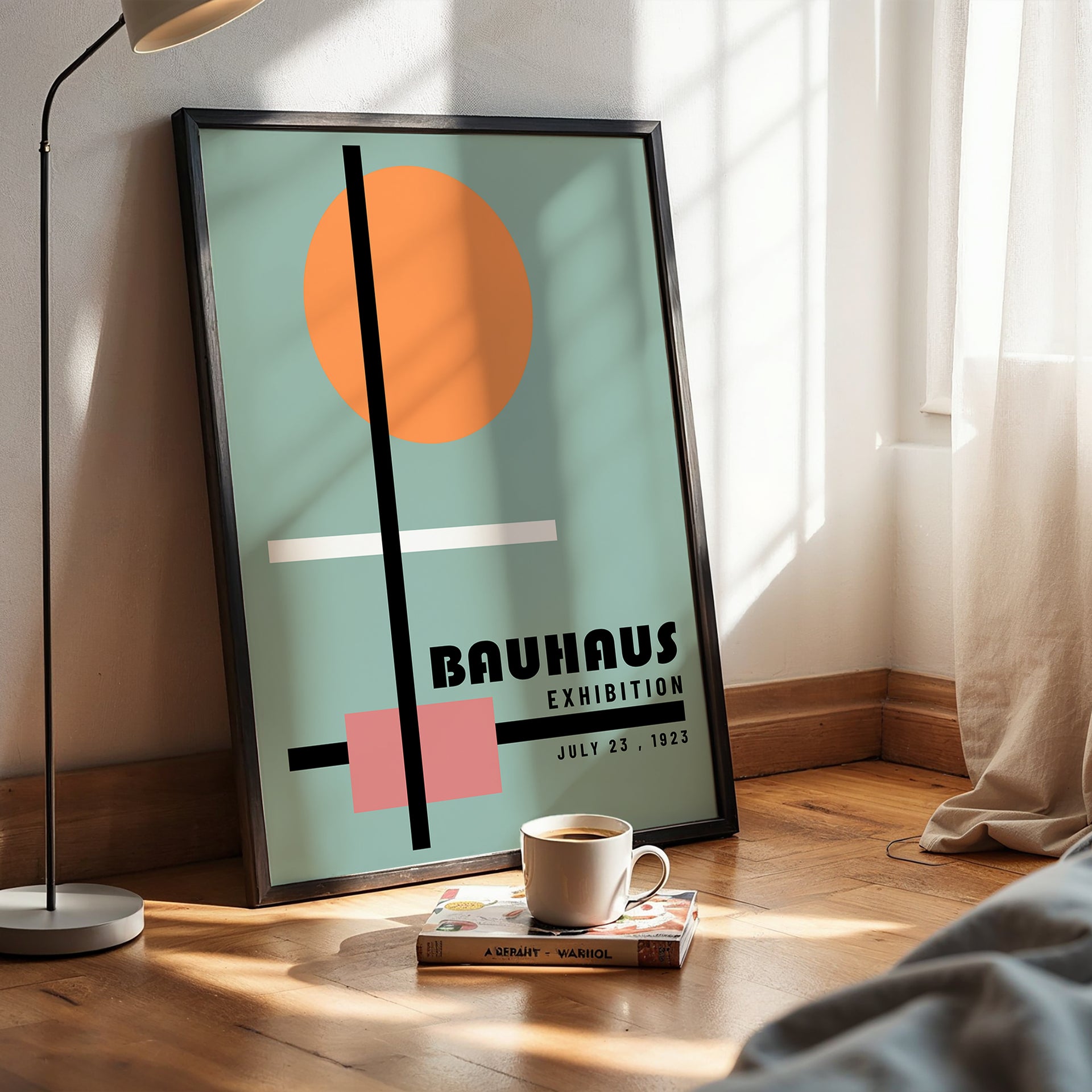 Influenced by early modernist design, the artwork reflects the Bauhaus approach to structure, clarity and function. Its muted tones and minimal layout make it an easy fit for contemporary, mid-century and design-led interiors.