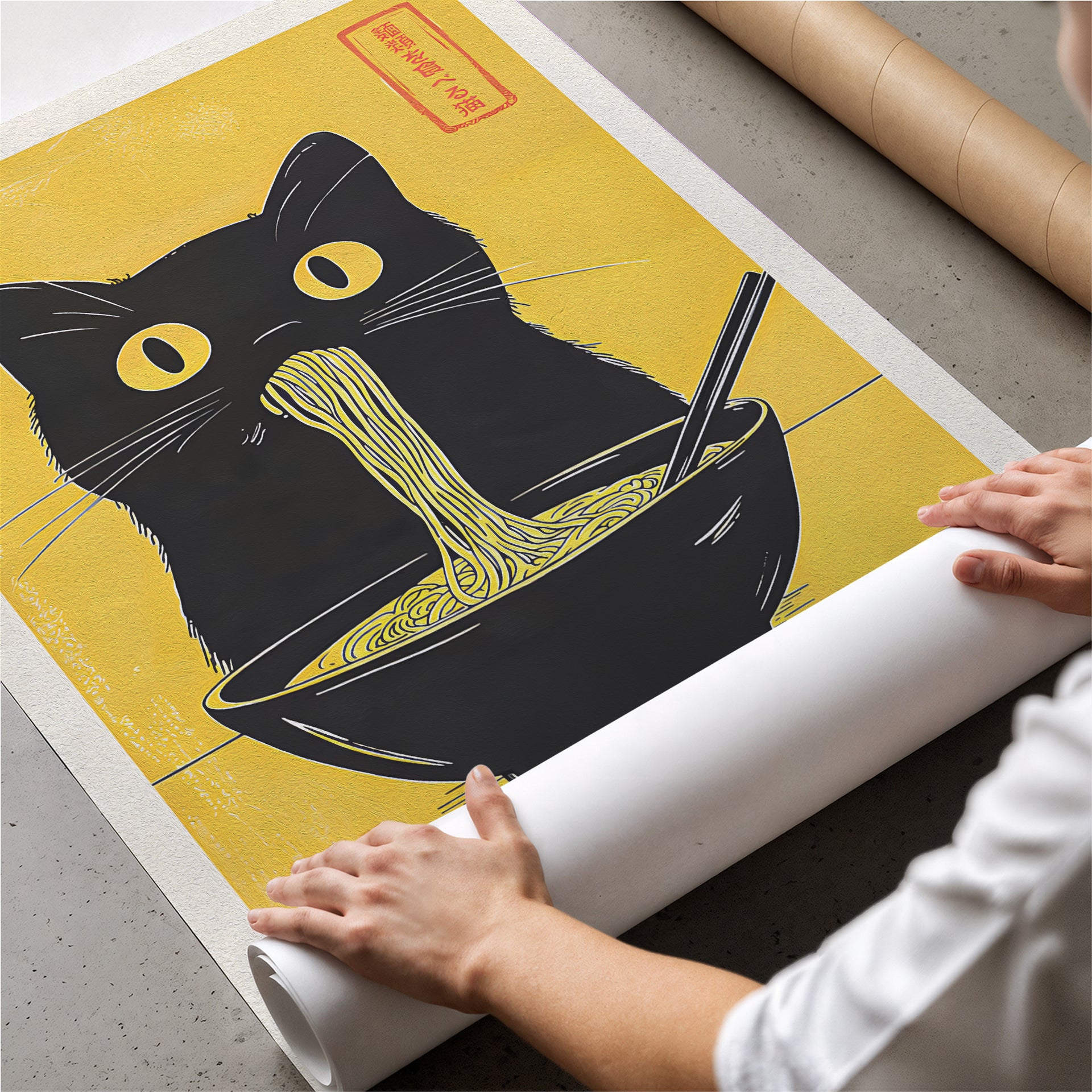 This contemporary illustration features a black cat paused mid-slurp over a bowl of ramen, set against a warm yellow background. Clean graphic shapes and bold contrast give the piece a playful, quietly humorous character.