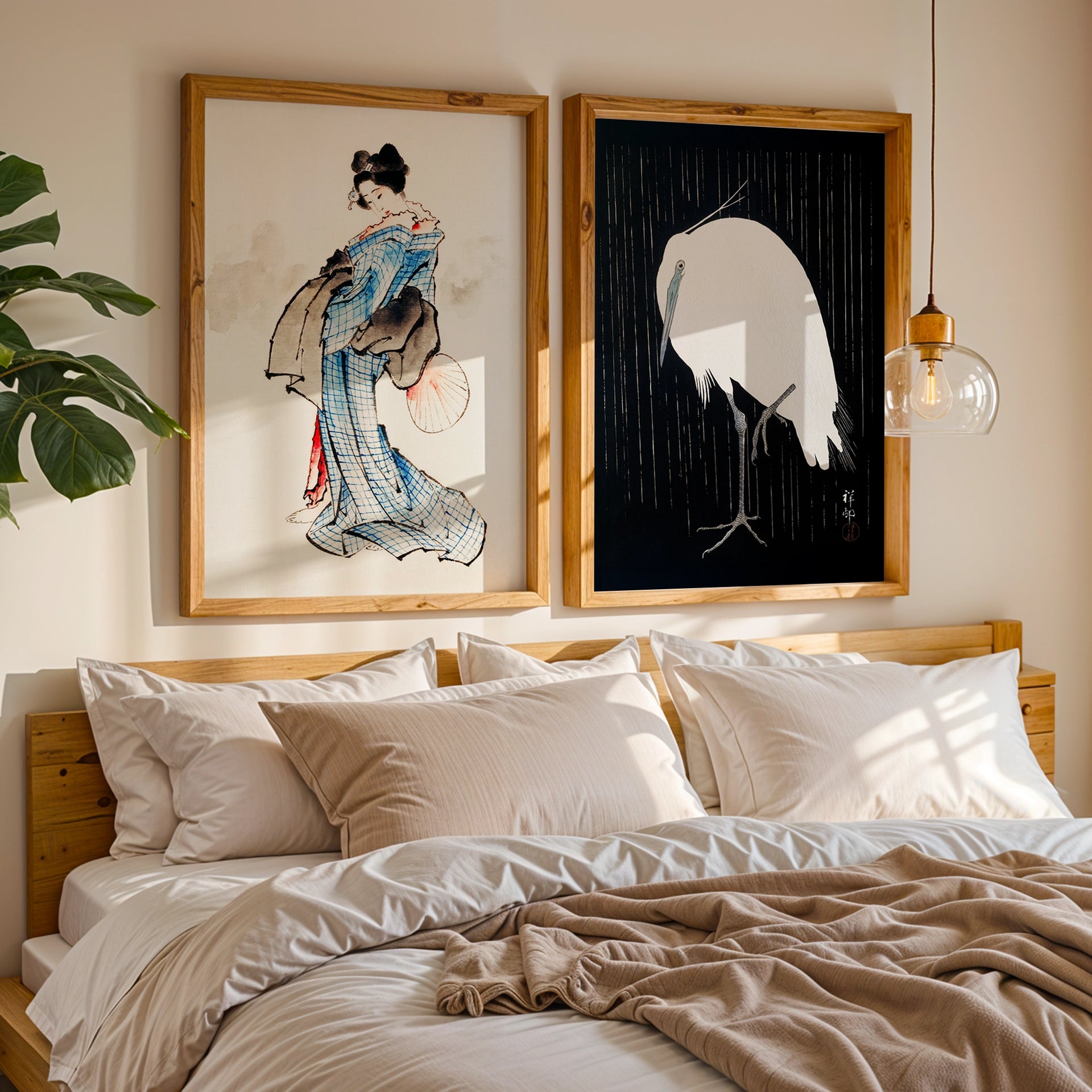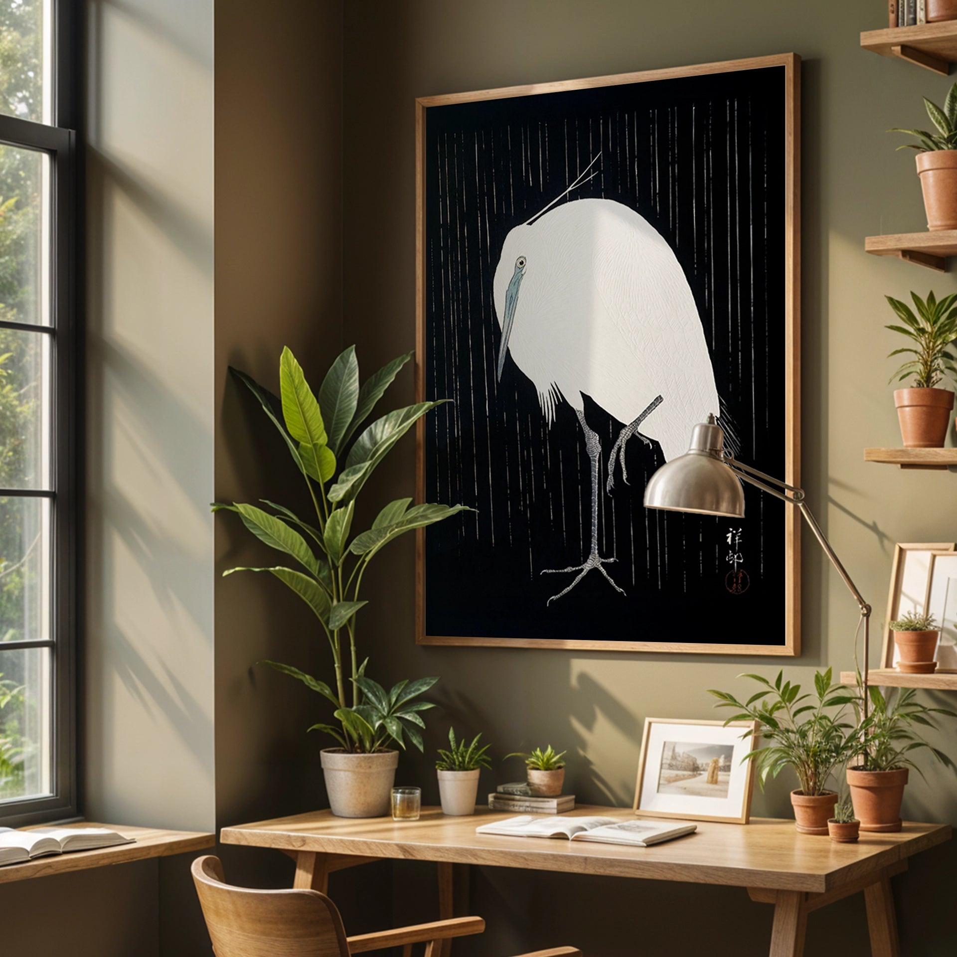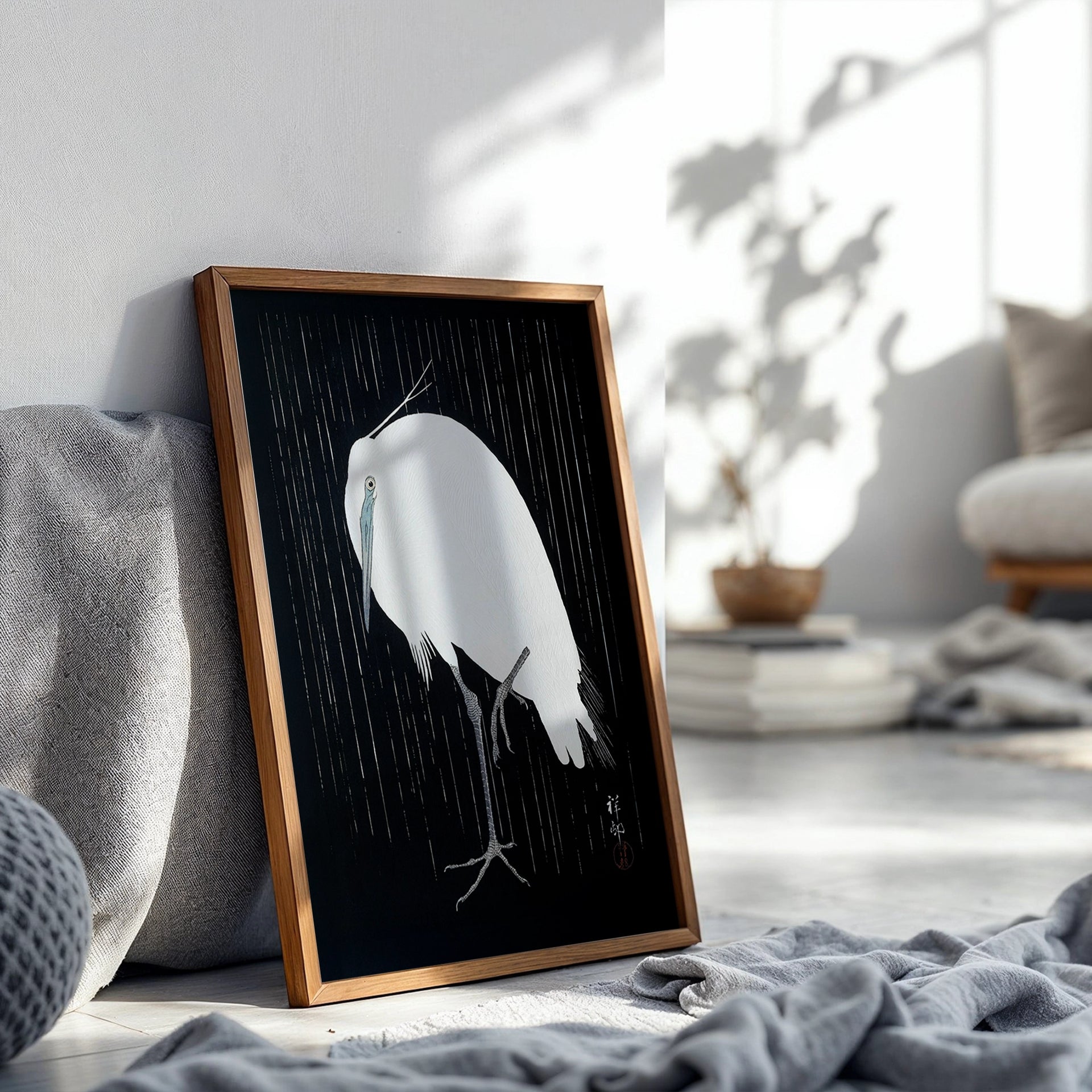 White Heron in the Rain, Shōtei Takahashi, Framed Giclée Fine Art Poster Print