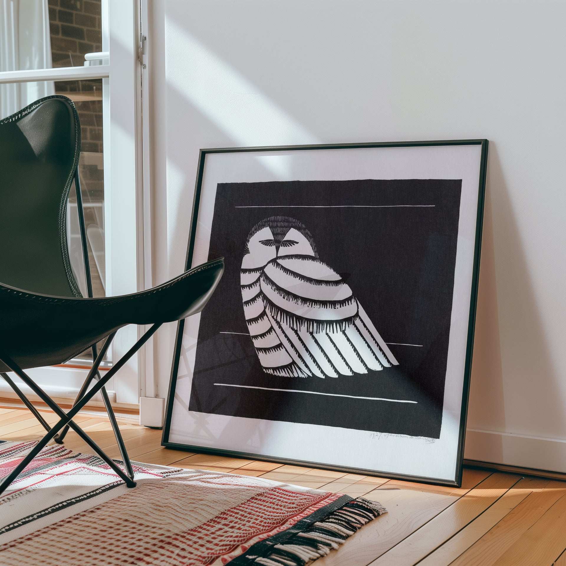 A bold woodcut of an owl by Samuel Jessurun de Mesquita, rendered with striking black-and-white contrasts and elegant stylisation. The artist’s pared-down composition highlights the bird’s sweeping feathers and mysterious presence, capturing both its stillness and latent power. De Mesquita’s animal prints remain some of his most celebrated works, admired for their modernist clarity and expressive force.