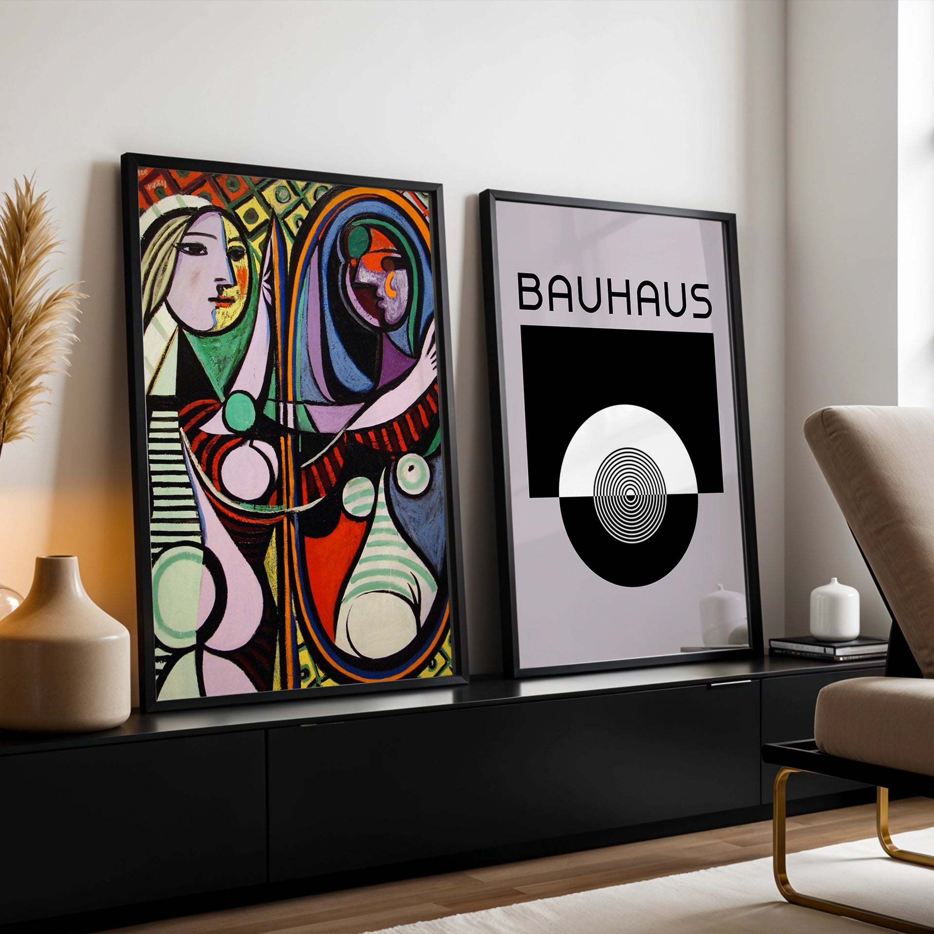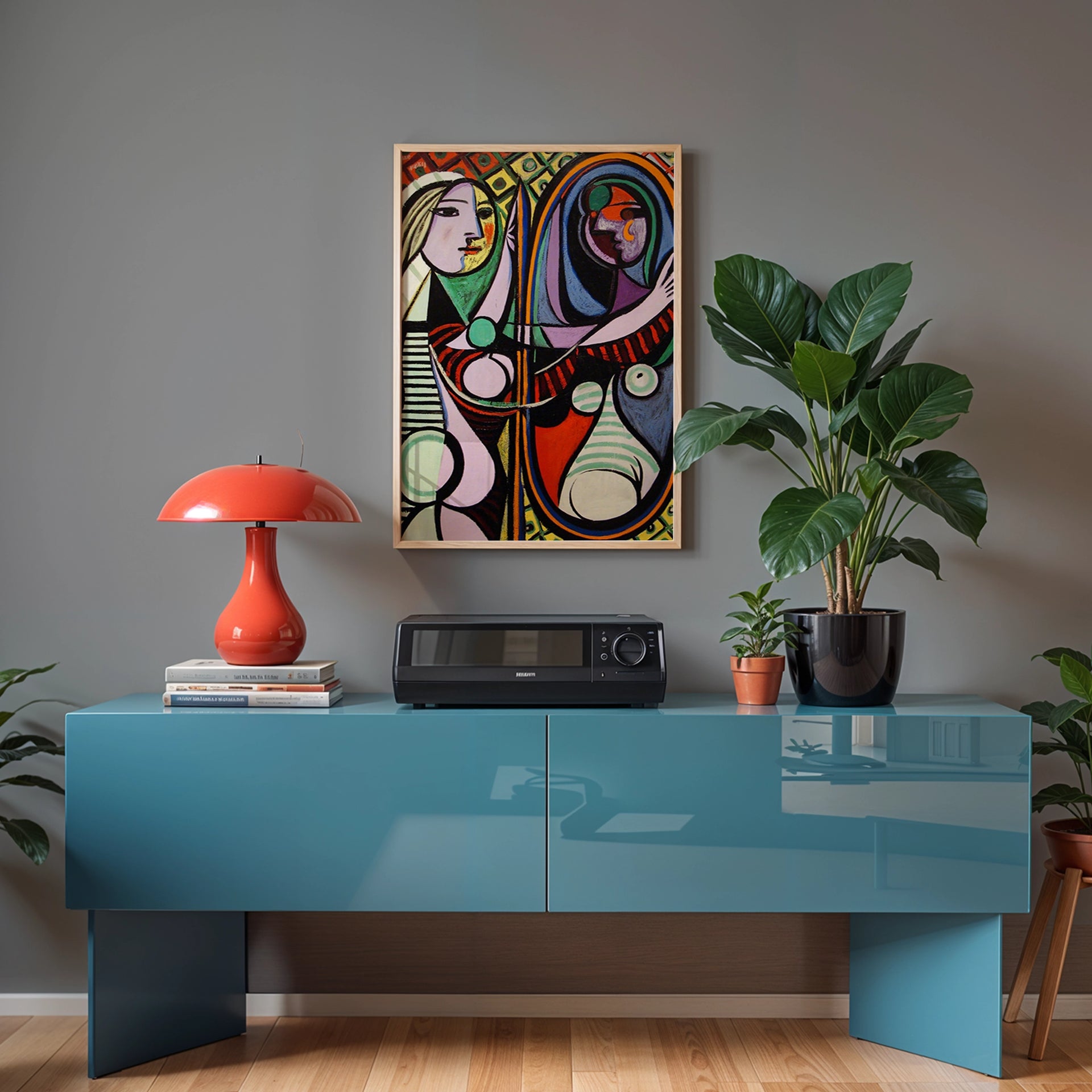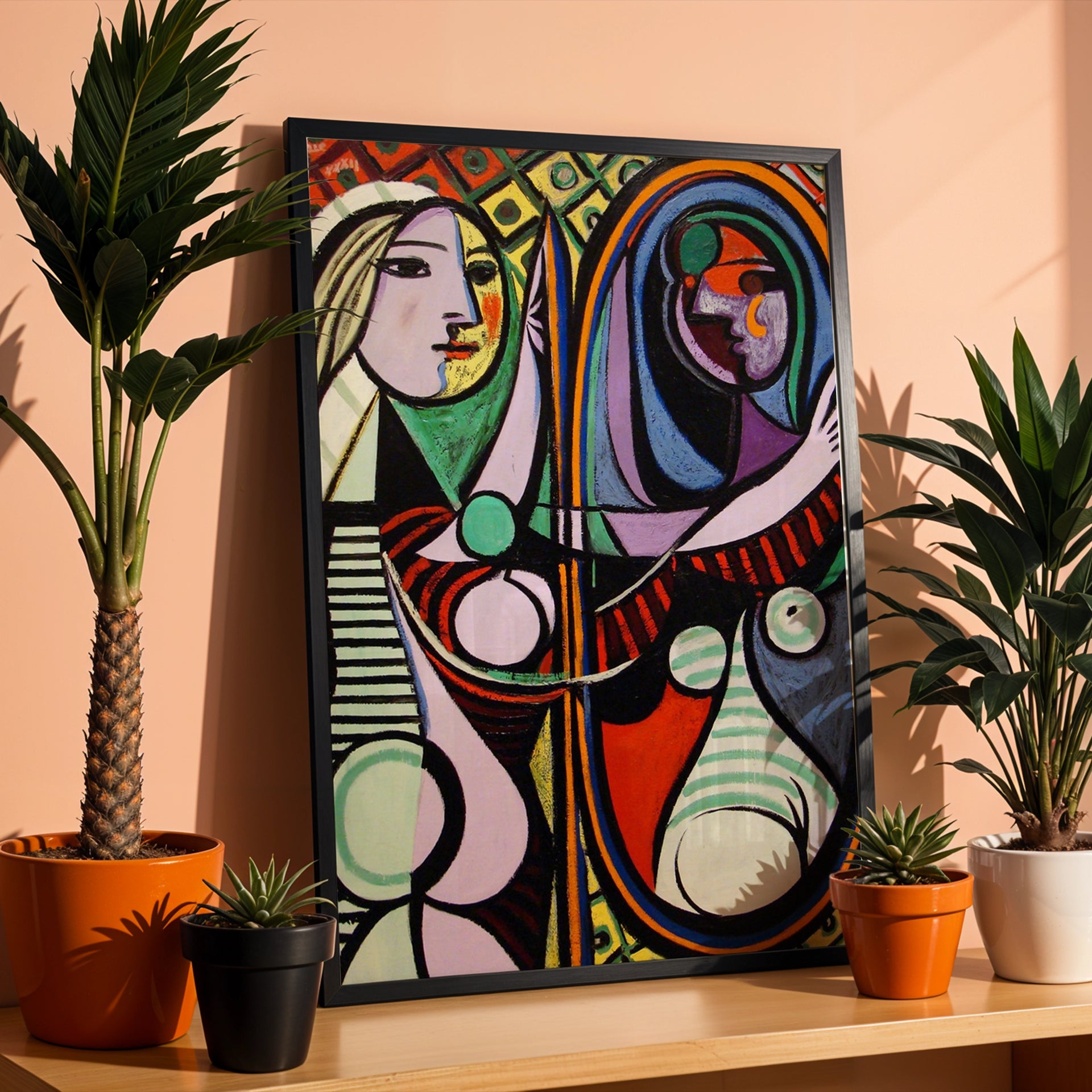 This print is a reproduction of Pablo Picasso's famous painting, Girl Before a Mirror, from 1932. The artwork is a vibrant and deeply symbolic work of both Cubism and Surrealism. It depicts the artist's muse, Marie-Thérèse Walter, gazing at her reflection, which is rendered in a different, more complex form, representing a psychological transformation.
