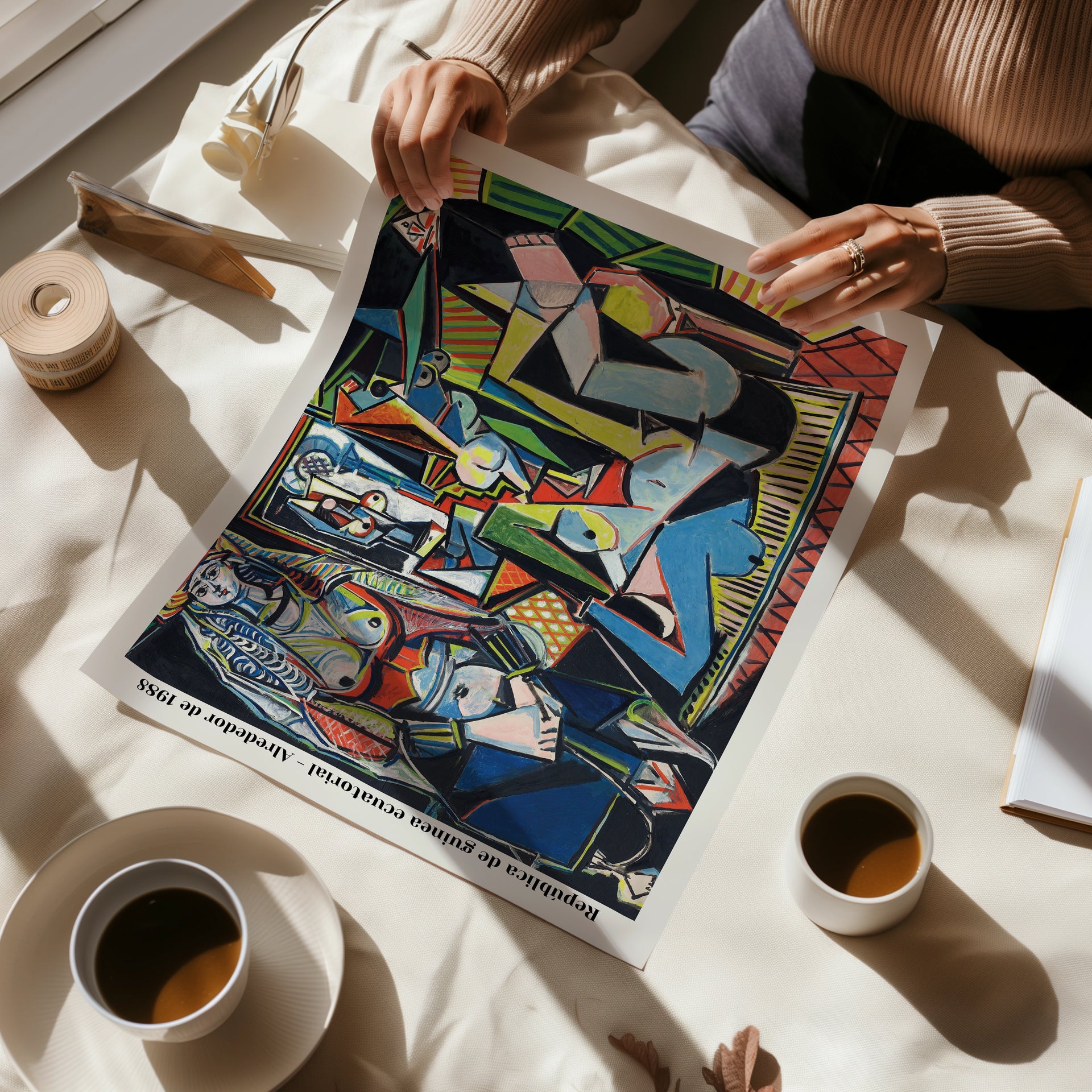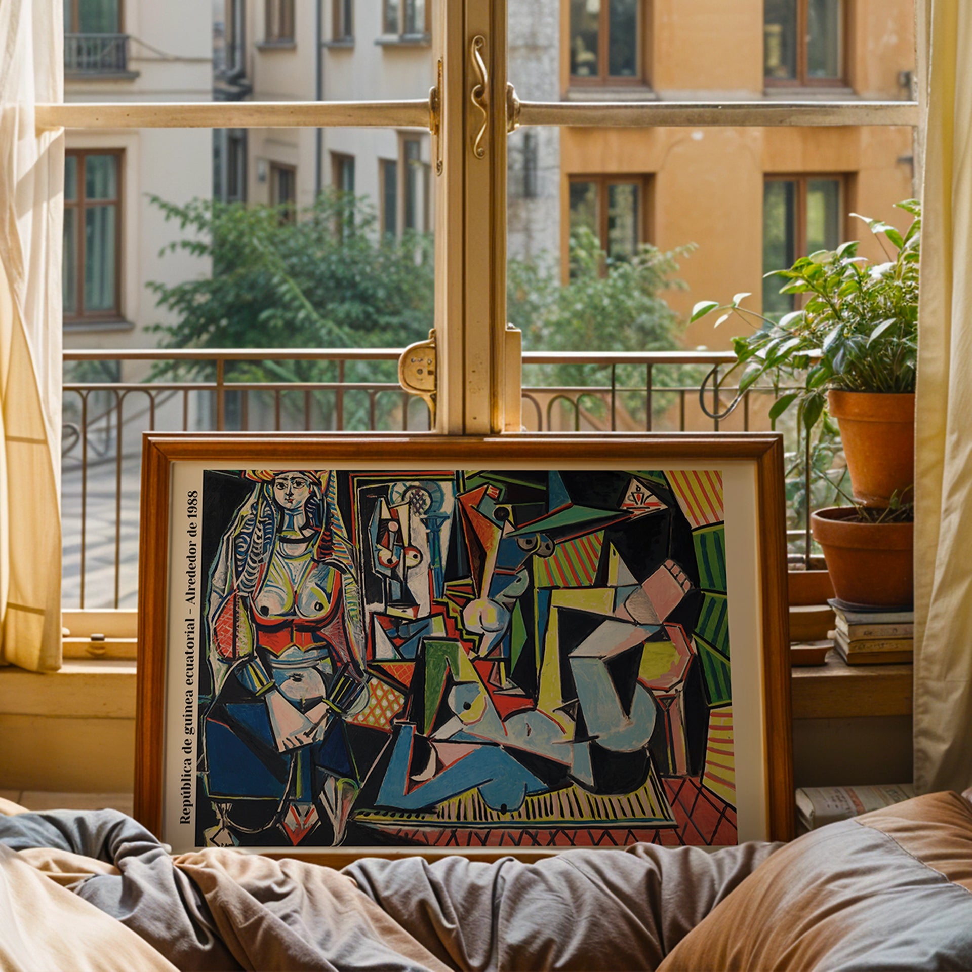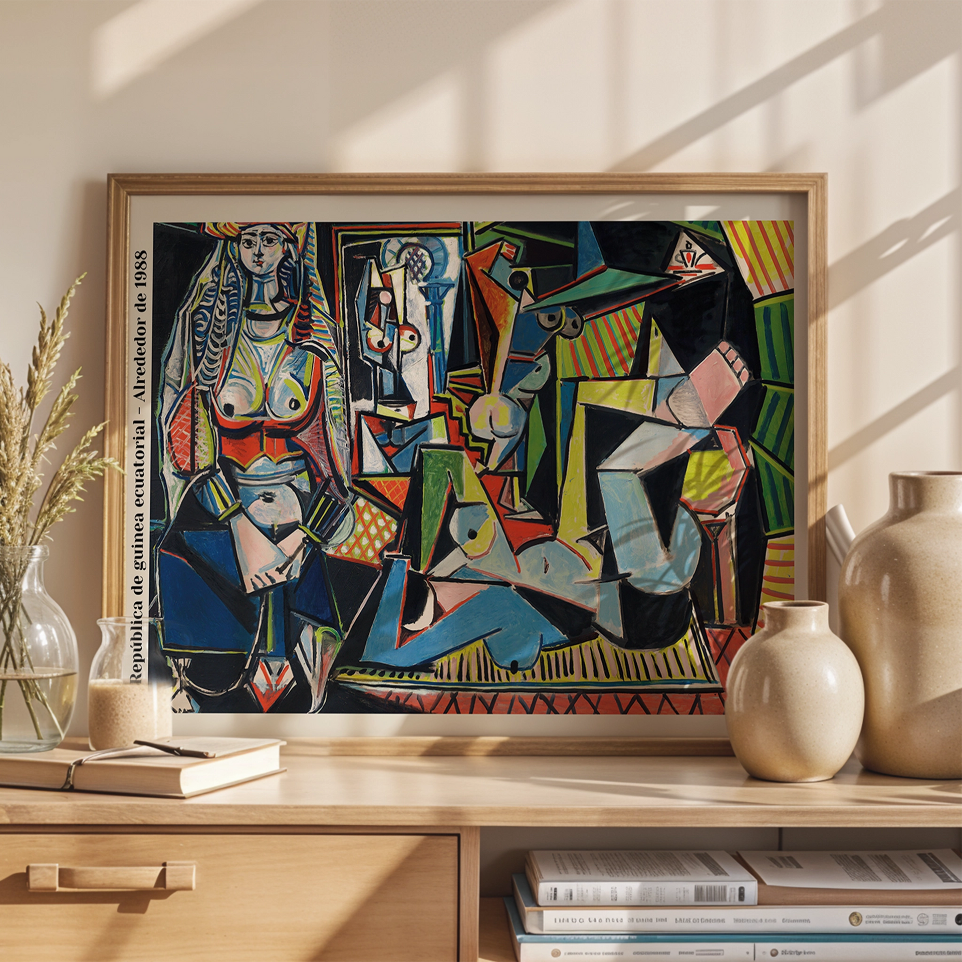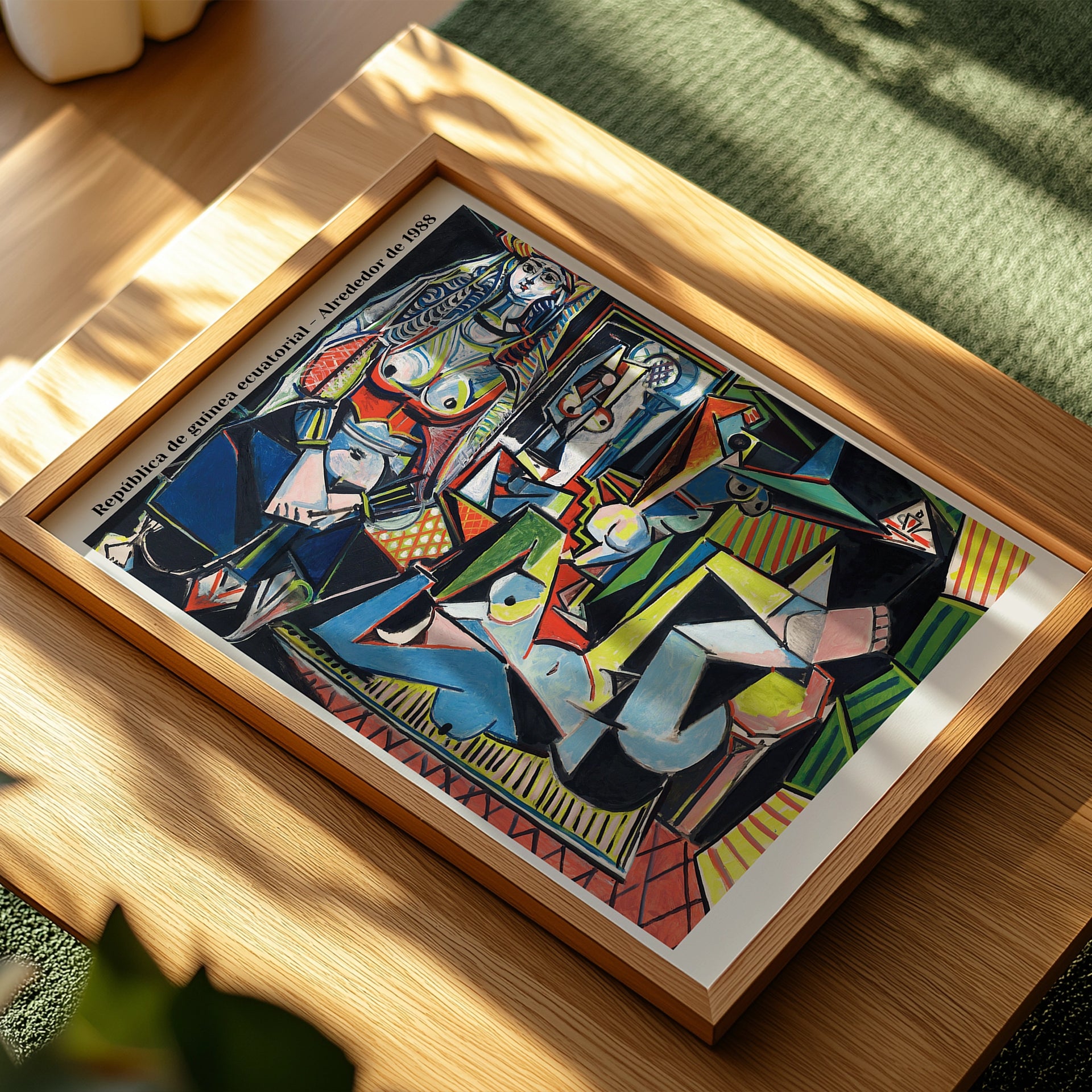 This print is a reproduction of Pablo Picasso's painting, Les Femmes d'Alger (Women of Algiers), Version 'O', from 1955. The artwork is a highly acclaimed example of his late Cubist style, featuring a complex and vibrant composition of fragmented female figures. The text on the side indicates that this specific print is a reproduction of a commemorative postage stamp from the Republic of Equatorial Guinea, issued around 1988.