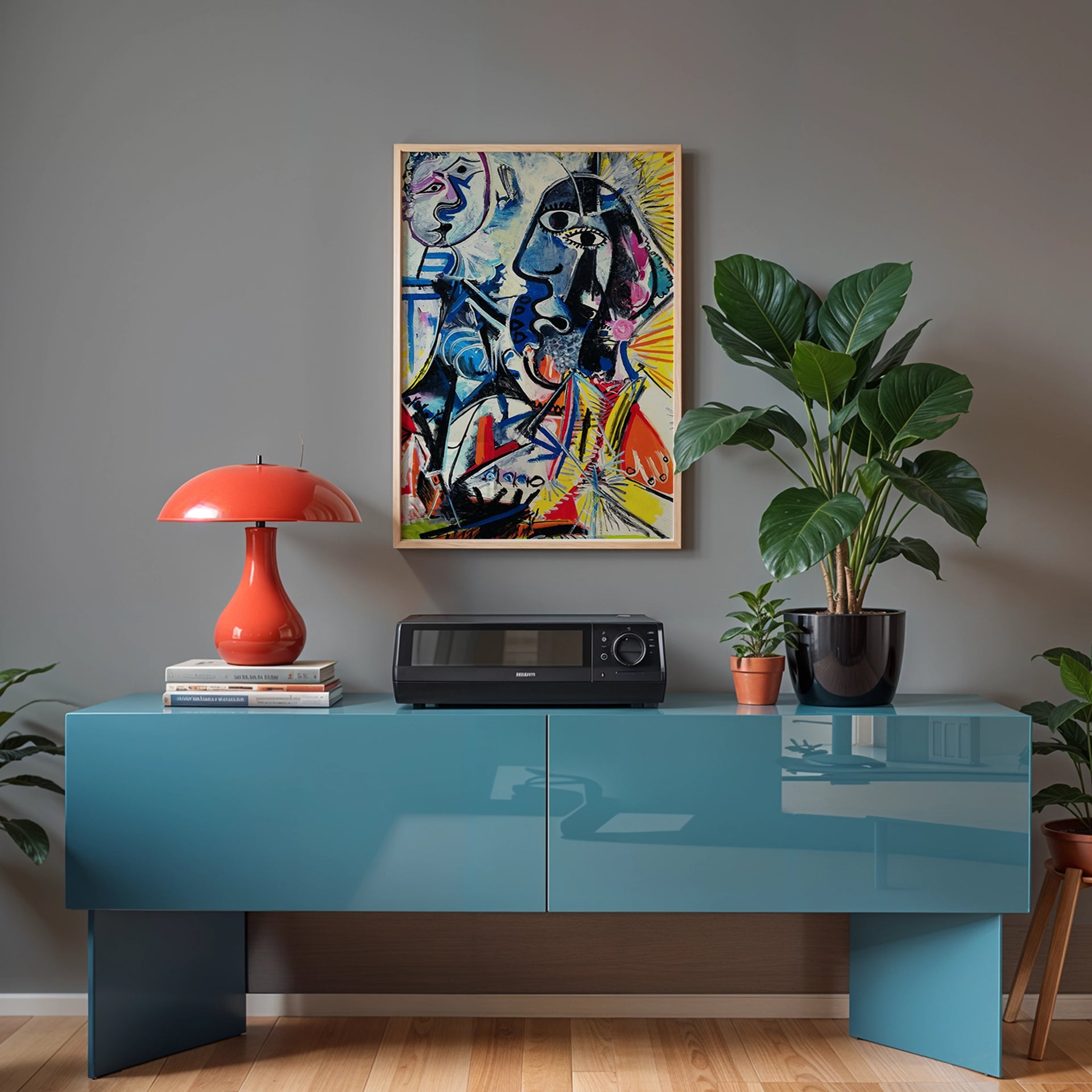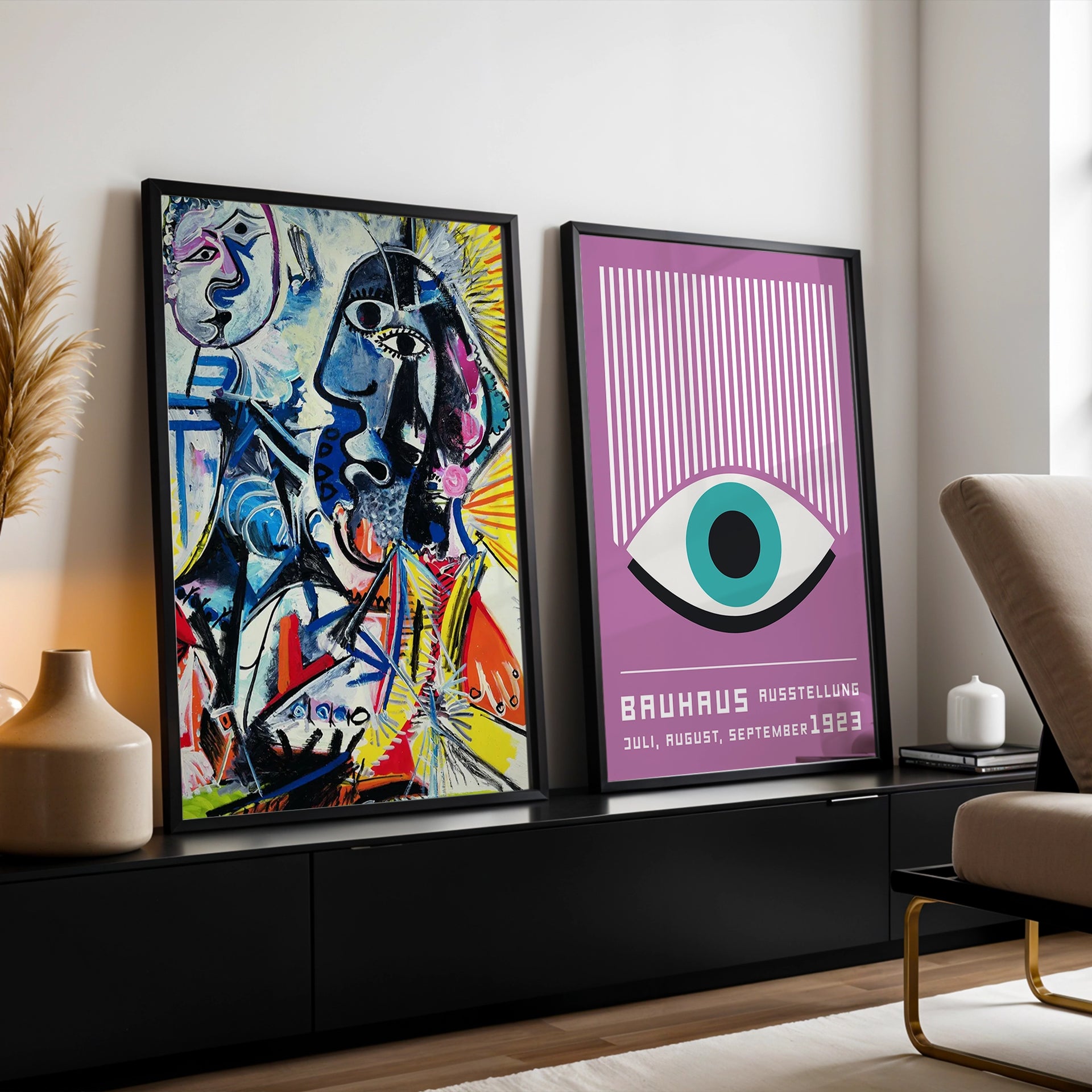 This print is a reproduction of Pablo Picasso's painting, Femme assise dans un fauteuil (Woman Sitting in an Armchair), from 1941. The artwork is a vibrant example of his Cubist-inspired style, with bold colors and fragmented forms. The central figure, a common subject of Picasso's work during this period, is depicted with a powerful and expressive quality.
