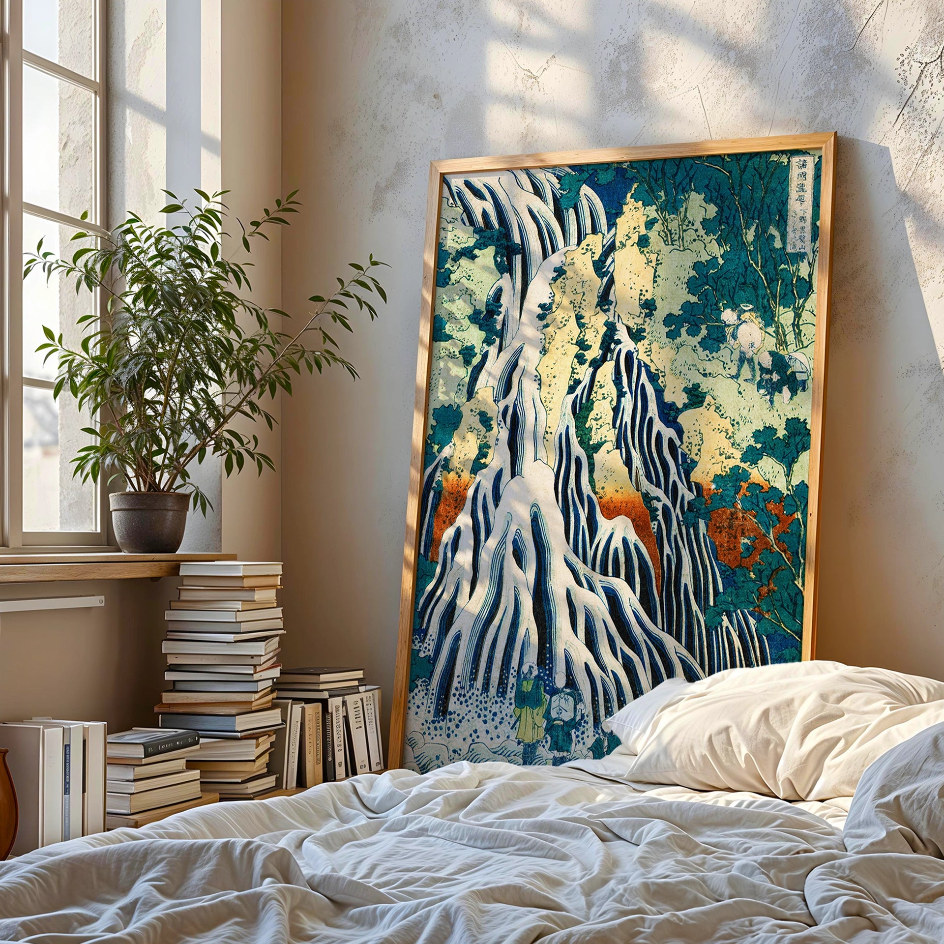 This print is a reproduction of a woodblock print by the master artist Katsushika Hokusai (1760-1849). The artwork, titled A Tour of the Waterfalls of the Provinces, is from his renowned series created around 1833-1834. It depicts a powerful waterfall cascading down a sheer rock face, with a figure standing on a bridge in the foreground, dwarfed by the scale of the natural landscape. The print is a stunning example of Hokusai's mastery of landscape, showcasing his innovative use of color and dramatic composition.