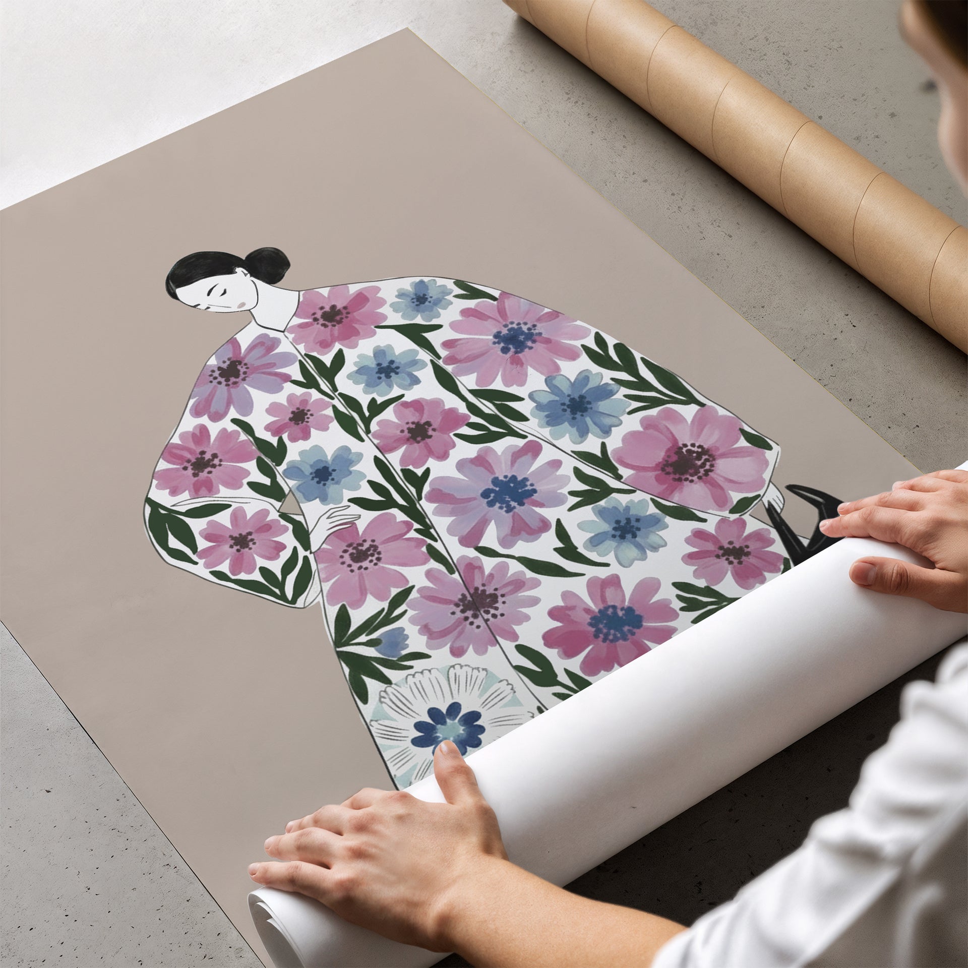 This contemporary illustration features a stylised female figure wrapped in a flowing floral garment, set against a warm neutral background. Soft colour and graphic line work combine to create a calm, balanced composition.