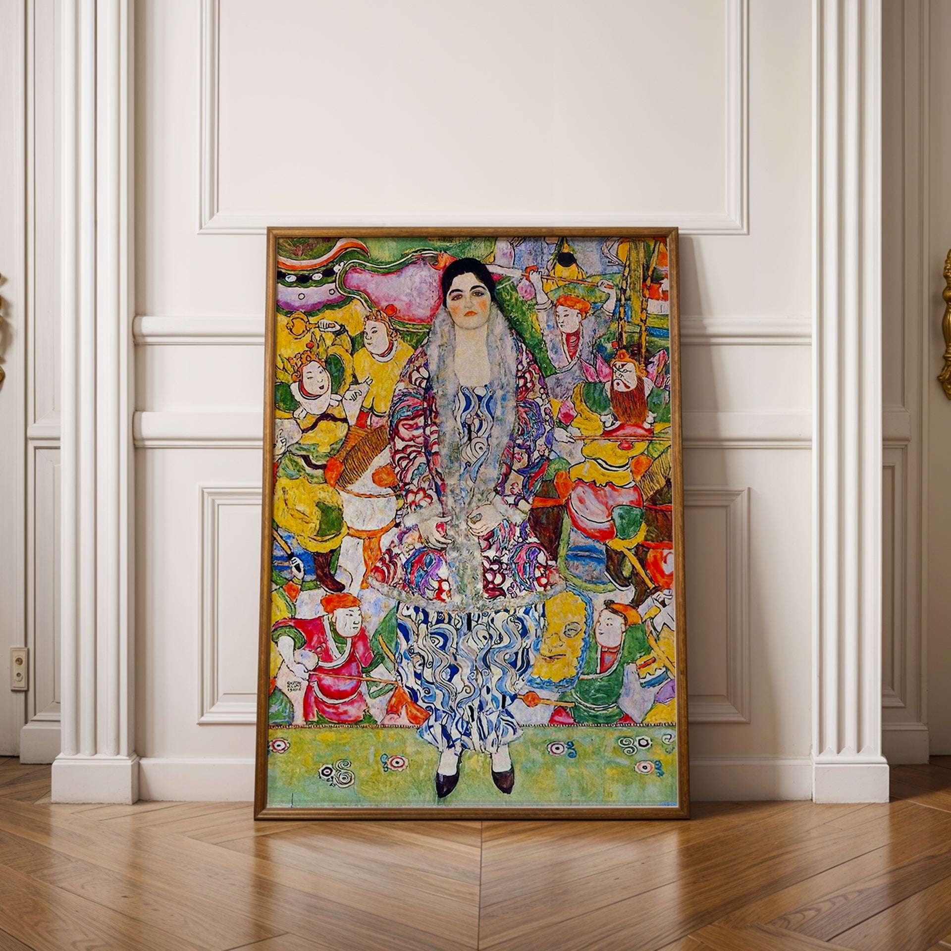 Painted during Klimt’s early golden period, the work reflects his distinctive fusion of portraiture, symbolism, and decorative abstraction. The flattened perspective and elaborate motifs anticipate the mature style for which Klimt later became renowned. Printed as a museum-quality giclée using archival inks on fine art paper, this piece offers a striking example of early 20th-century modernism.