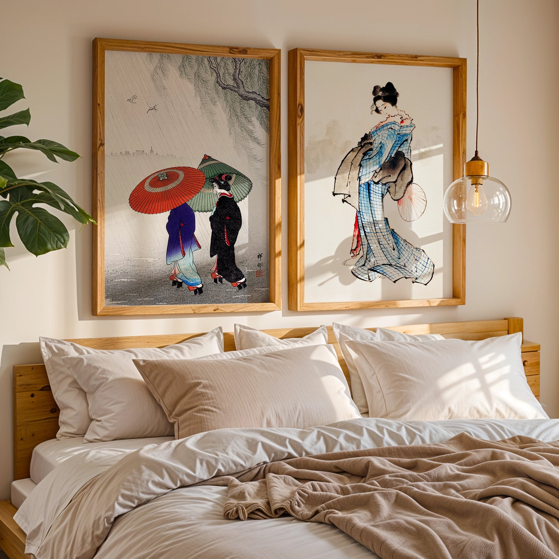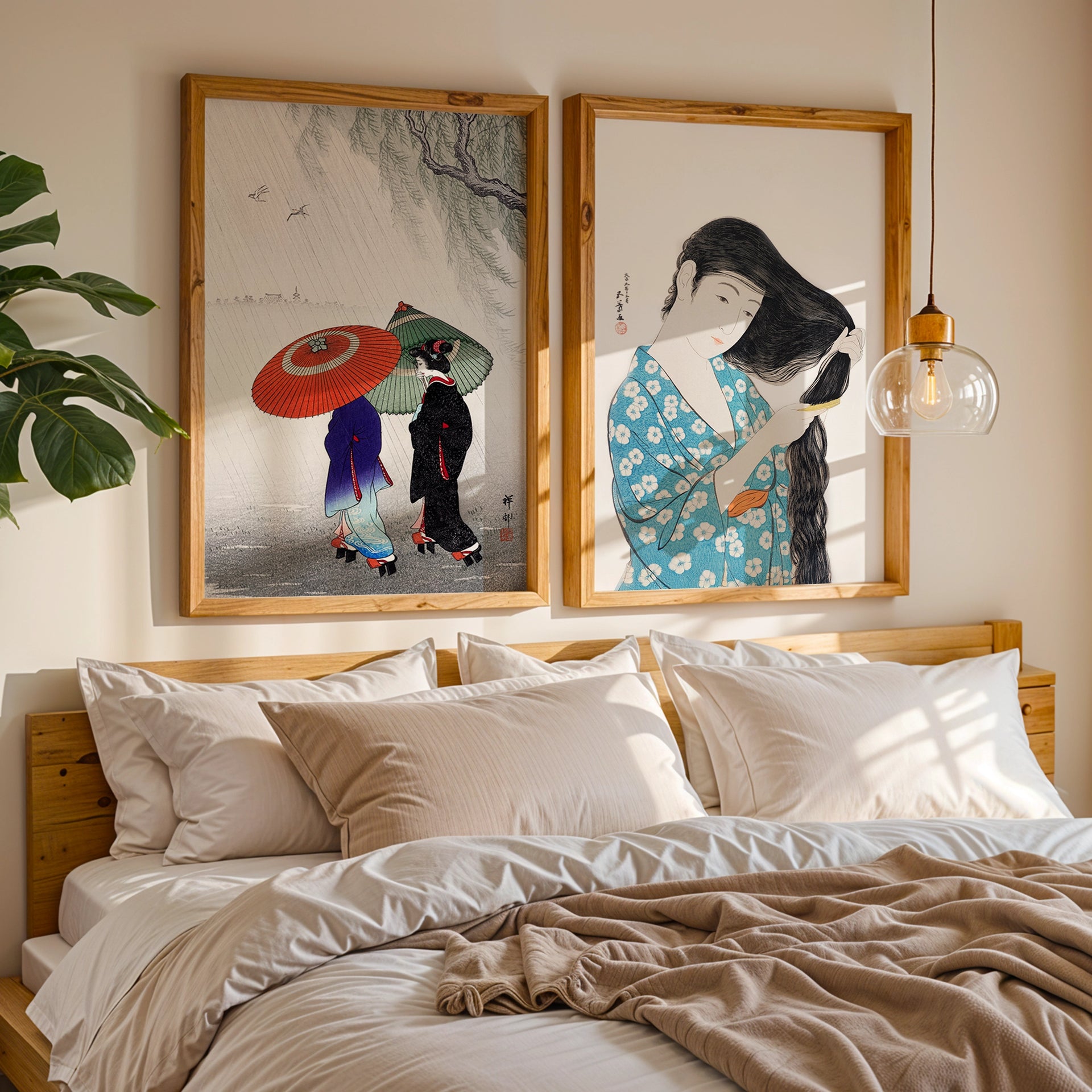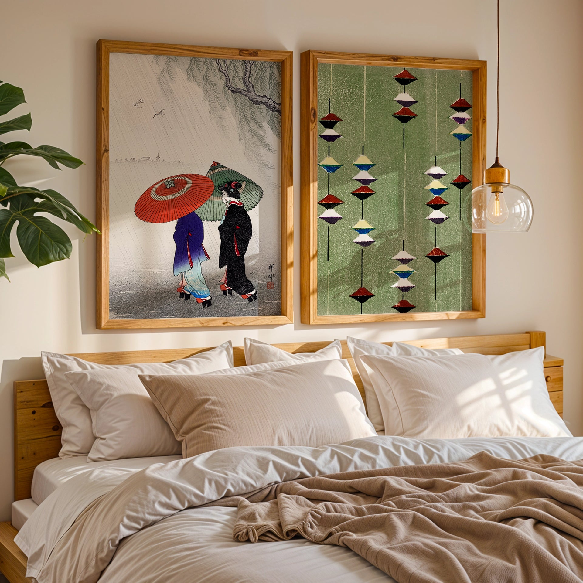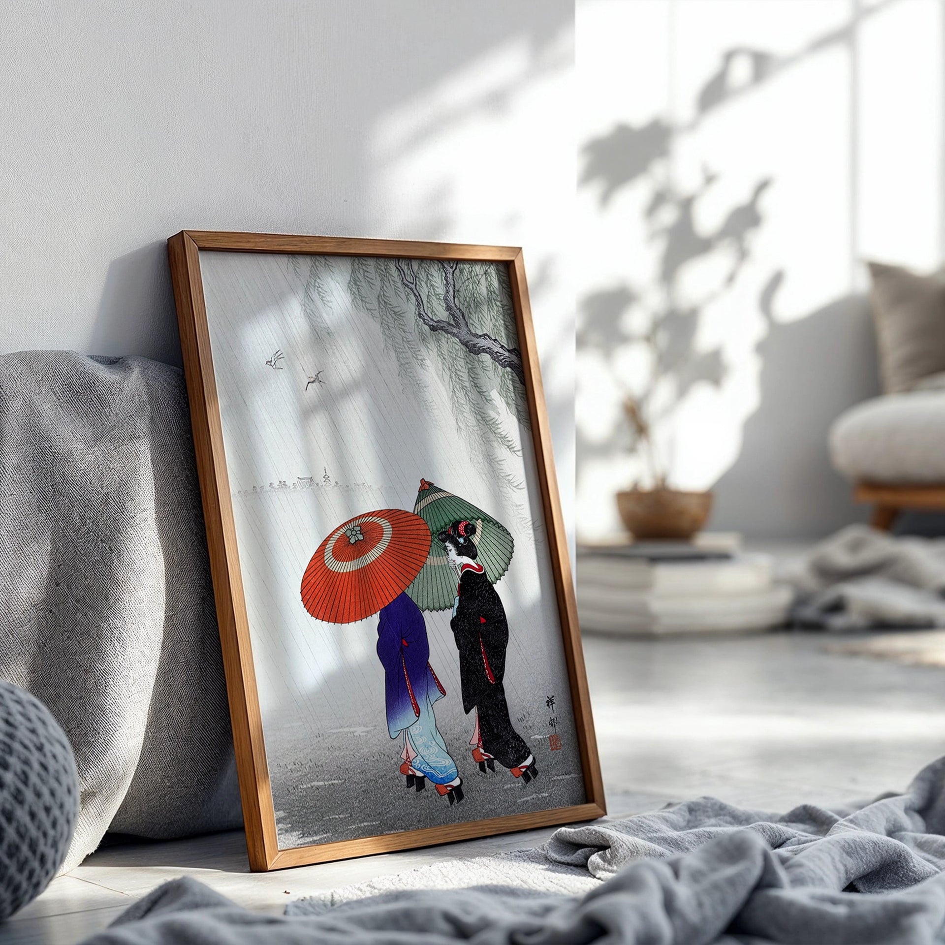 This print is a beautiful woodblock print by the Japanese artist Itō Shinsui (1898-1972), a leading figure of the Shin-hanga art movement. The artwork is titled Rain in the Night and was created in 1920. It depicts two women in traditional kimonos walking under umbrellas in the rain, with a delicate weeping willow in the background. The print has a rich, authentic vintage aesthetic, showcasing the movement's focus on combining traditional Japanese themes with a modern, painterly quality.