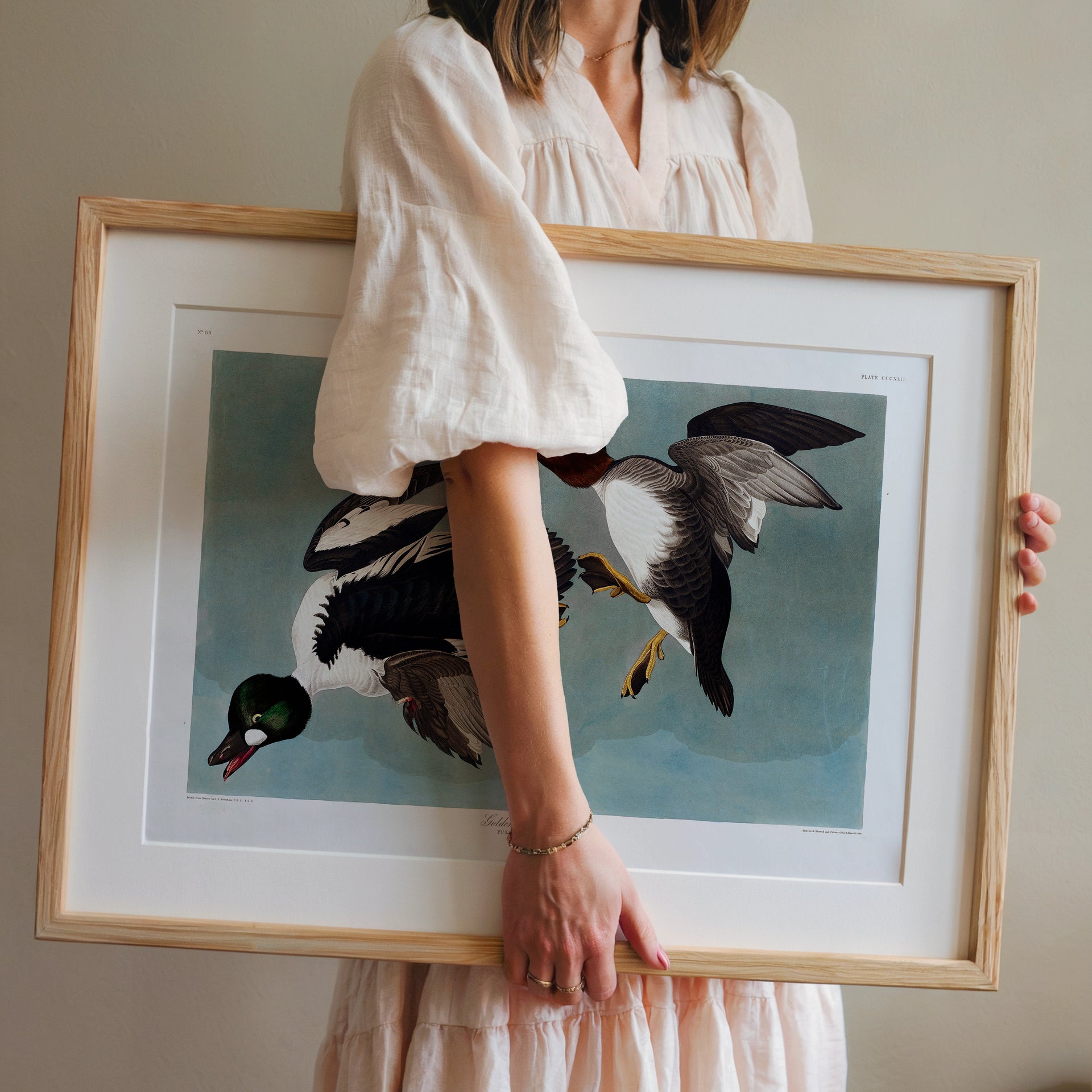 This print of the Golden-eye Duck is a reproduction of a hand-coloured engraving by the artist John James Audubon. It is a plate from his famous book, The Birds of America, published in the 19th century. The artwork depicts a pair of ducks in flight, showcasing the species' vibrant plumage and the dramatic composition characteristic of Audubon's work.