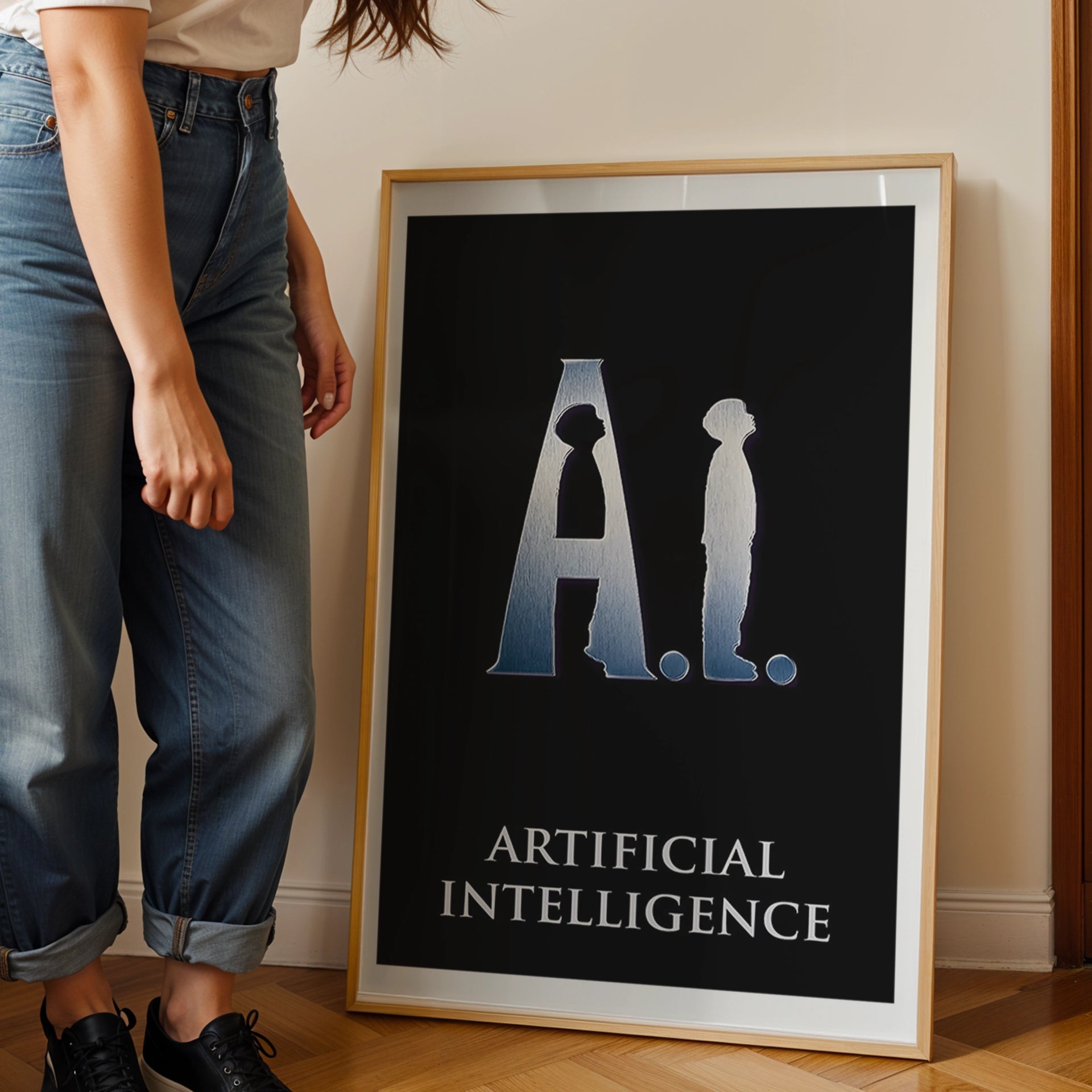 This striking poster for Steven Spielberg's 2001 film, A.I. Artificial Intelligence, features a minimalist design. The stylised letters "A.I." are cleverly integrated to form the silhouettes of a child and an adult, visually representing the film's central themes of humanity and technology.
