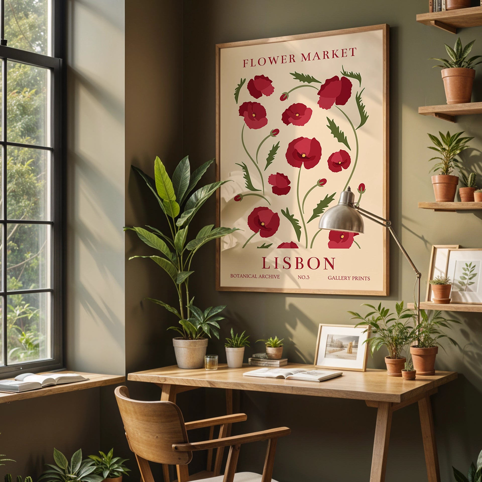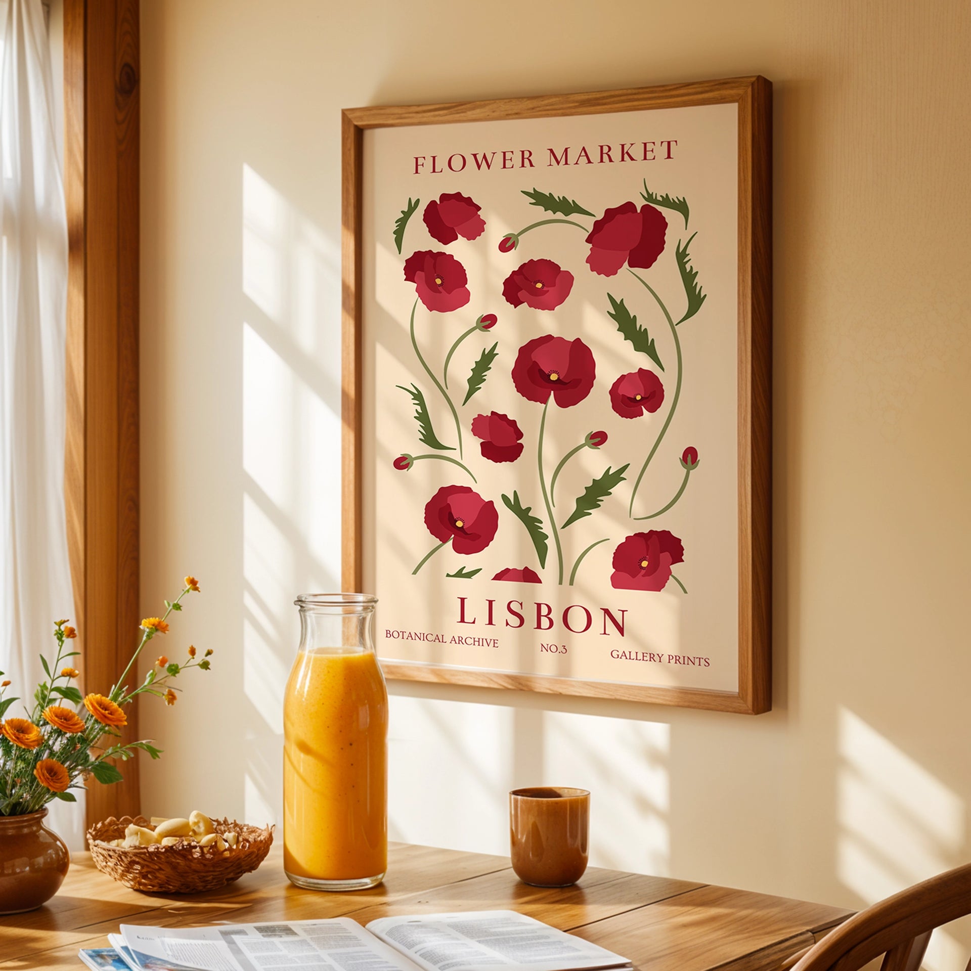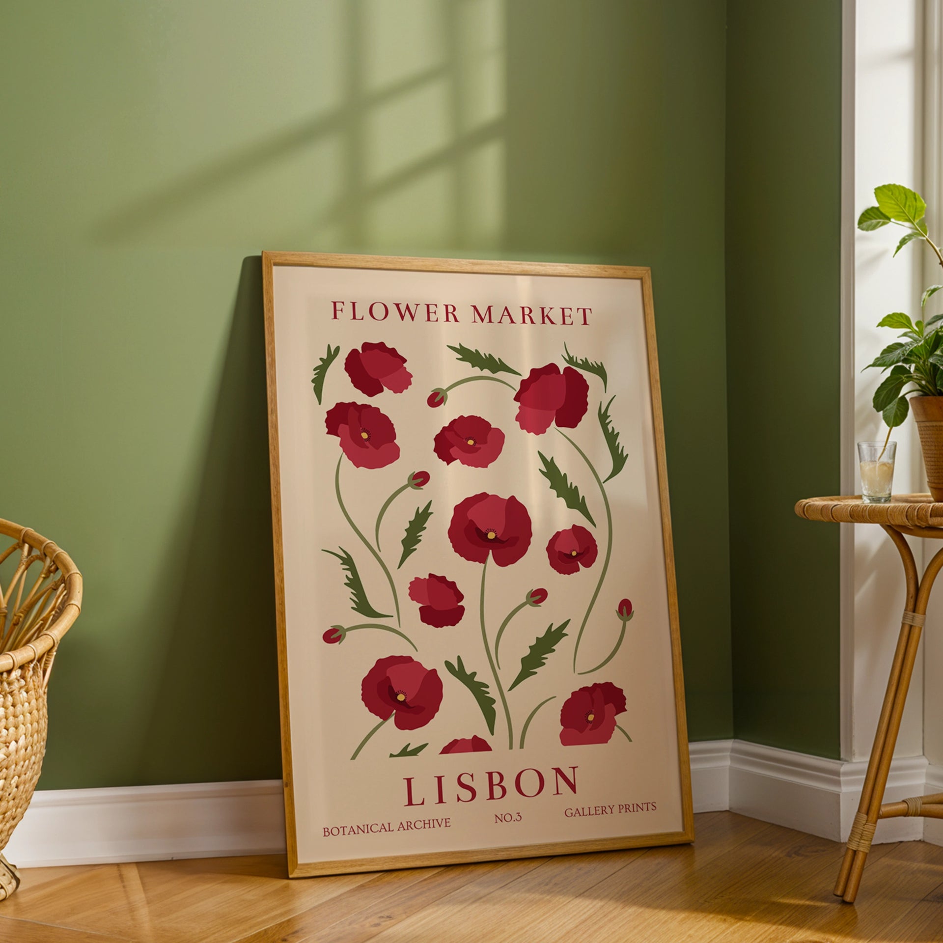 This print, titled 'Lisbon Flower Market', is a modern botanical illustration. It features an arrangement of stylised red flowers and green leaves on a light beige background, with the title and 'Botanical Archive' branding at the bottom.