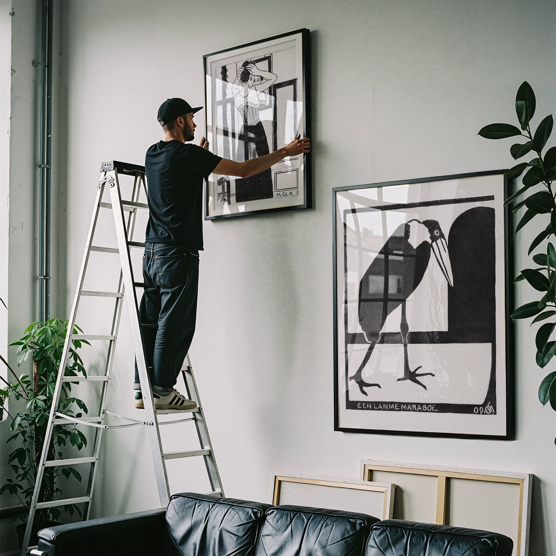 A powerful black-and-white woodcut by Samuel Jessurun de Mesquita, depicting a marabou stork with striking stylisation and bold contrast. Titled “Een Lame Maraboe” (“A Lame Marabou”), the work showcases the artist’s ability to combine natural form with graphic abstraction, turning a simple bird study into a compelling, almost emblematic composition. A fine example of de Mesquita’s mastery of line and silhouette, perfect for collectors of Art Nouveau and early modernist printmaking.
