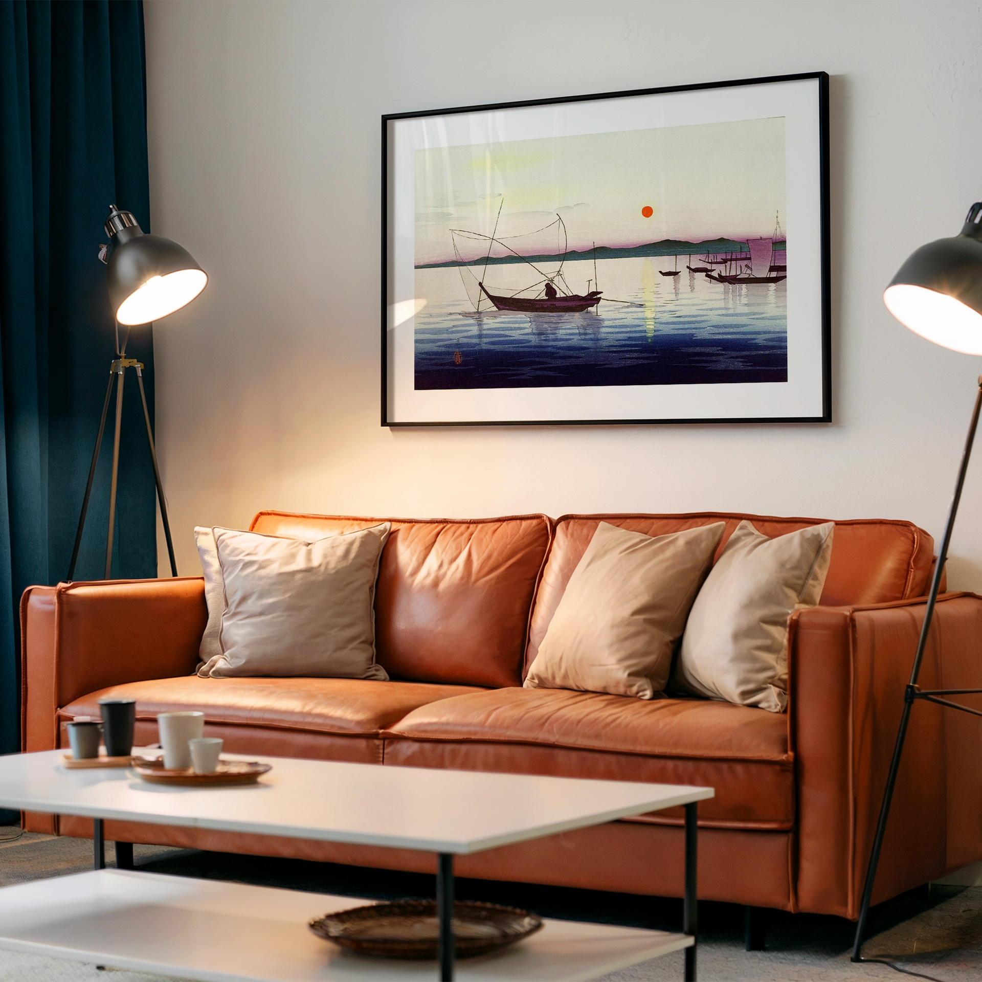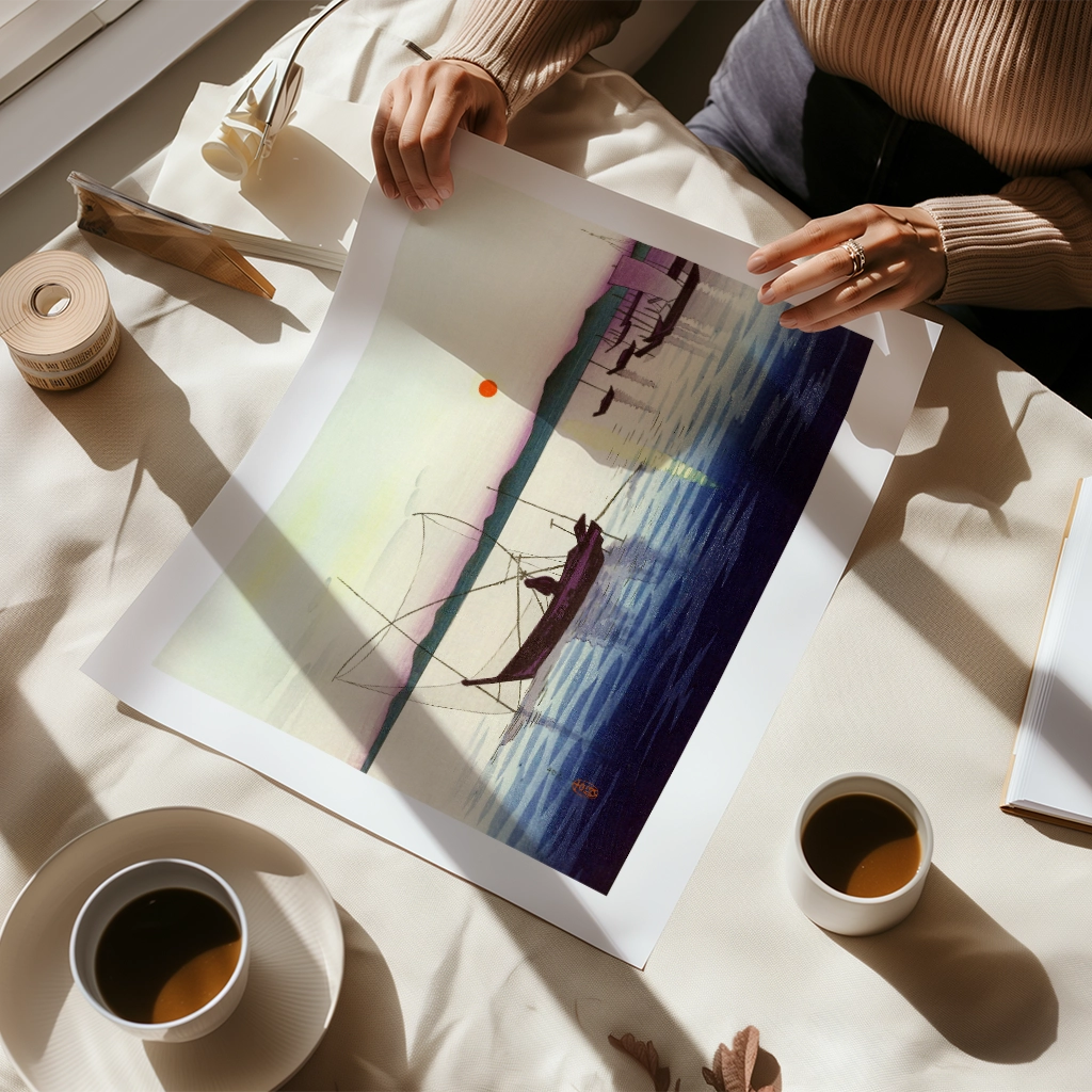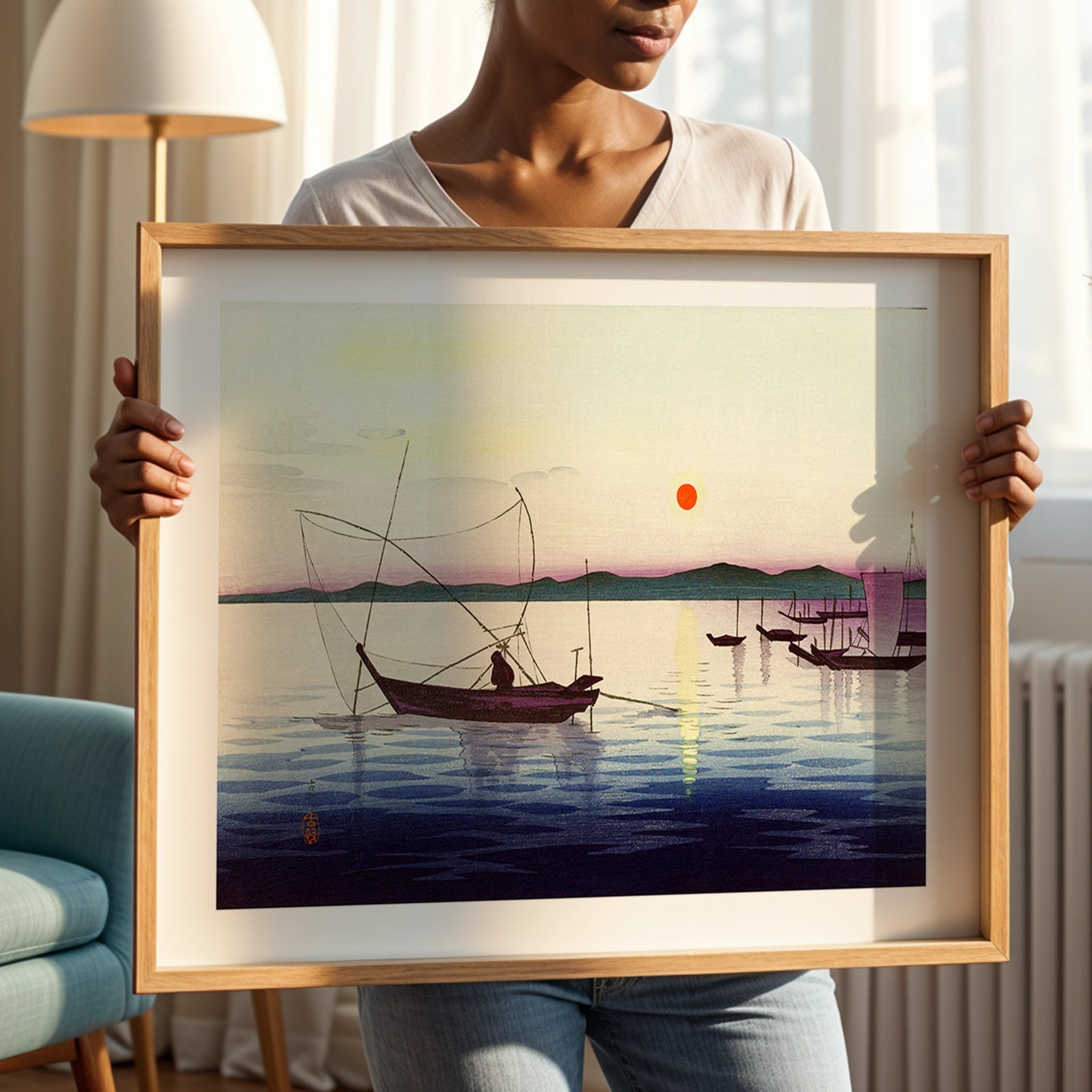 This art print vividly captures a serene fishing scene under a twilight sky, characteristic of vintage Japanese art. It showcases traditional boats with intricate nets upon calm waters, beautifully evoking a sense of peaceful labor. This piece exemplifies the timeless aesthetic and natural tranquility found in Japanese artistic heritage.