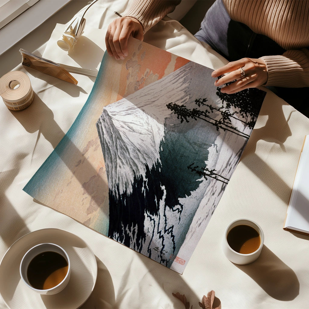 This print is a reproduction of one of the most famous Japanese woodblock prints, South Wind, Clear Sky (Gaifū kaisei), often called Red Fuji, by the master artist Katsushika Hokusai. Created around 1830–1831, it is from his celebrated series Thirty-six Views of Mount Fuji. The artwork captures a serene morning view of the mountain with a reddish hue, a snow-capped peak, and a sky filled with delicate clouds.